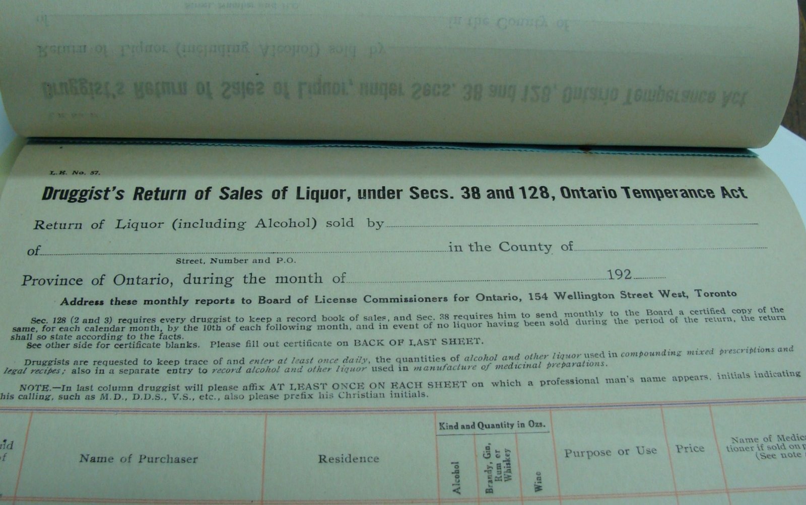 This was what you would have had to do in Ontario in 1925, anyway. Deseronto Archives holds a ‘Register of Liquor Sales’ which records sales of alcohol made by local druggist T. L. McCullough between October 16, 1925 and May 31, 1927. Under the terms of the Ontario Temperance Act of 1916, a customer was only allowed to buy alcohol if he or she had obtained a prescription from a doctor who had deemed “intoxicating liquor necessary for the health of his patient”.