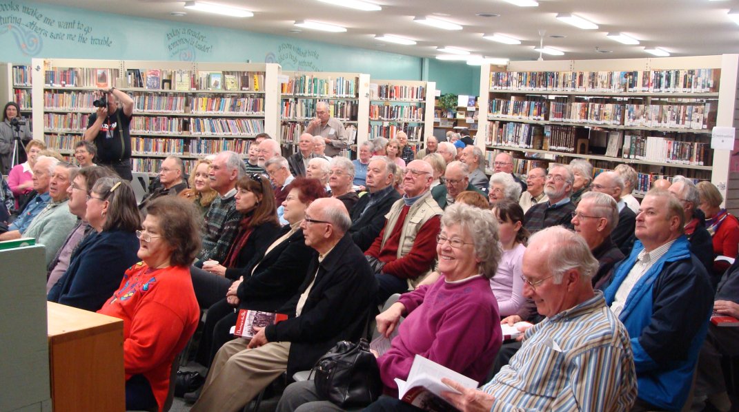 It was a wonderful afternoon and a tribute to the huge amount of work that went into the preparation, particularly by Deseronto’s Librarian, Frances Smith, by Dana Valentyne of the Deseronto Revitalization Program, and by the Chair of the Deseronto Public Library Board, Don Simpson. Many thanks to them, to Deseronto’s Mayor, Norm Clark, for a great welcoming address, and to the sponsors of the raffle prize: Greenleys Bookstore, The Chocolate Room and the Small Town Café and Bakery. Thanks also to Lori Brooks of the Deseronto Job Information Centre (whose domain was requisitioned for the book-signing) and to everyone who came – you helped to make this event a huge success.