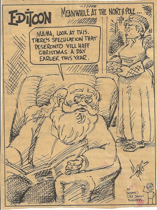 This festive cartoon came in today in a file of tourism-related flyers and correspondence from Deseronto’s Town Hall. It dates from late 1993 and is possibly from one of the Napanee newspapers. It’s rather puzzling though: does anyone know what had been celebrated a day earlier in Deseronto that year, to trigger this?