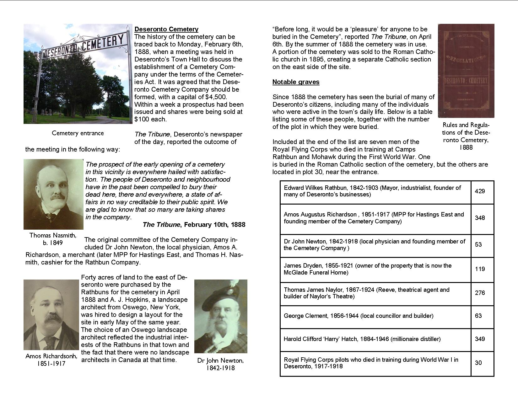 The original committee of the Cemetery Company included Dr John Newton, the local physician, Amos A. Richardson, a merchant (later MPP for Hastings East), and Thomas H. Nasmith, cashier for the Rathbun Company.
