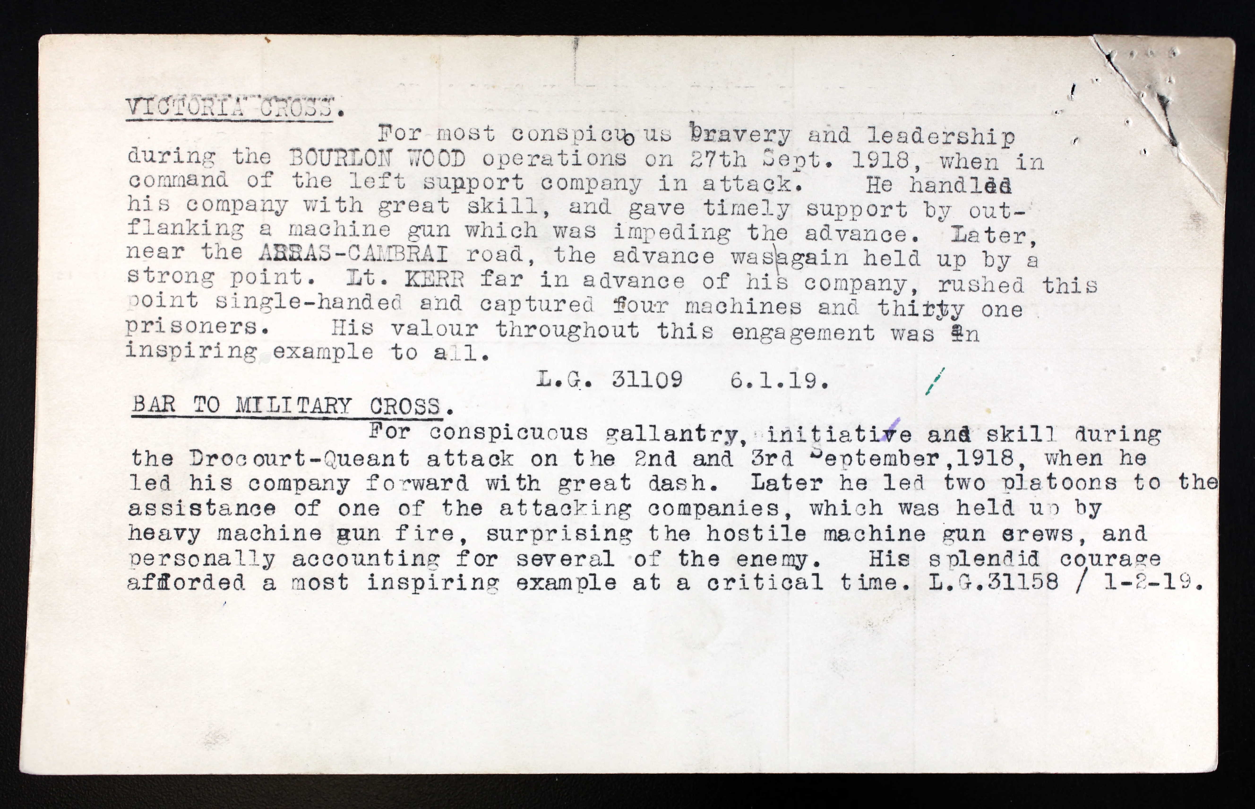 For most conspicuous bravery and leadership during the BOURLON WOOD operations on 27th Sept. 1918, when in command of the left support company in attack. He handled his company with great skill, and gave timely support by out-flanking a machine gun which was impeding the advance. Later, near the ARRAS-CAMBRAI road, the advance was again held up by a strong point. Lt. KERR far in advance of his company, rushed this point single-handed and captured four machines and thirty one prisoners. His valour throughout this engagement was an inspiring example to all. L.G. 31109 6.1.19