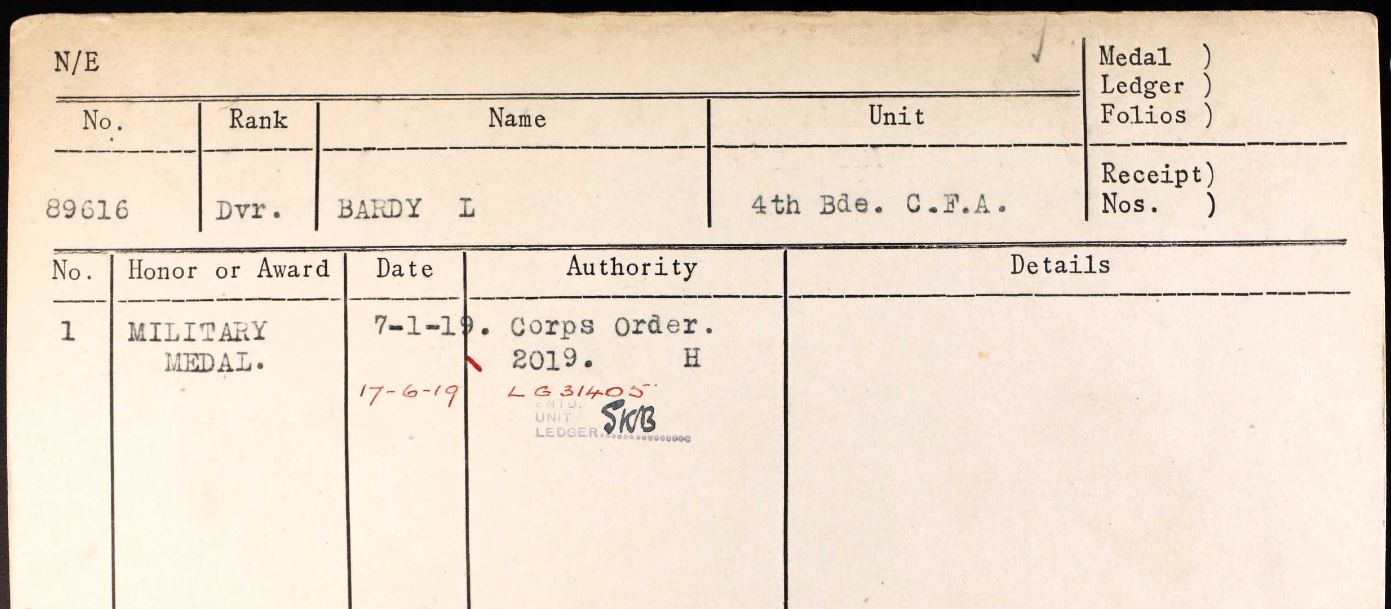 Bardy left England on June 23rd, 1919 on the SS Belgic and was demobilized in Kingston on July 3rd.