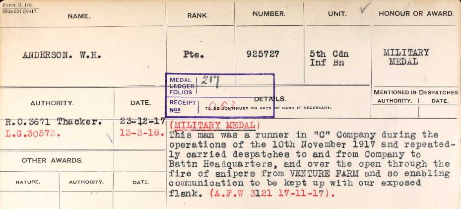 Anderson was involved in the Second Battle of Passchendaele and was awarded the Military Medal.