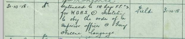 31-10-18 Sentenced to 14 days F.P. [Field Punishment] #2 for W.O.A.S. [while on active service] (1) Hesitating to obey the order of a superior officer (2) Using obscene language.