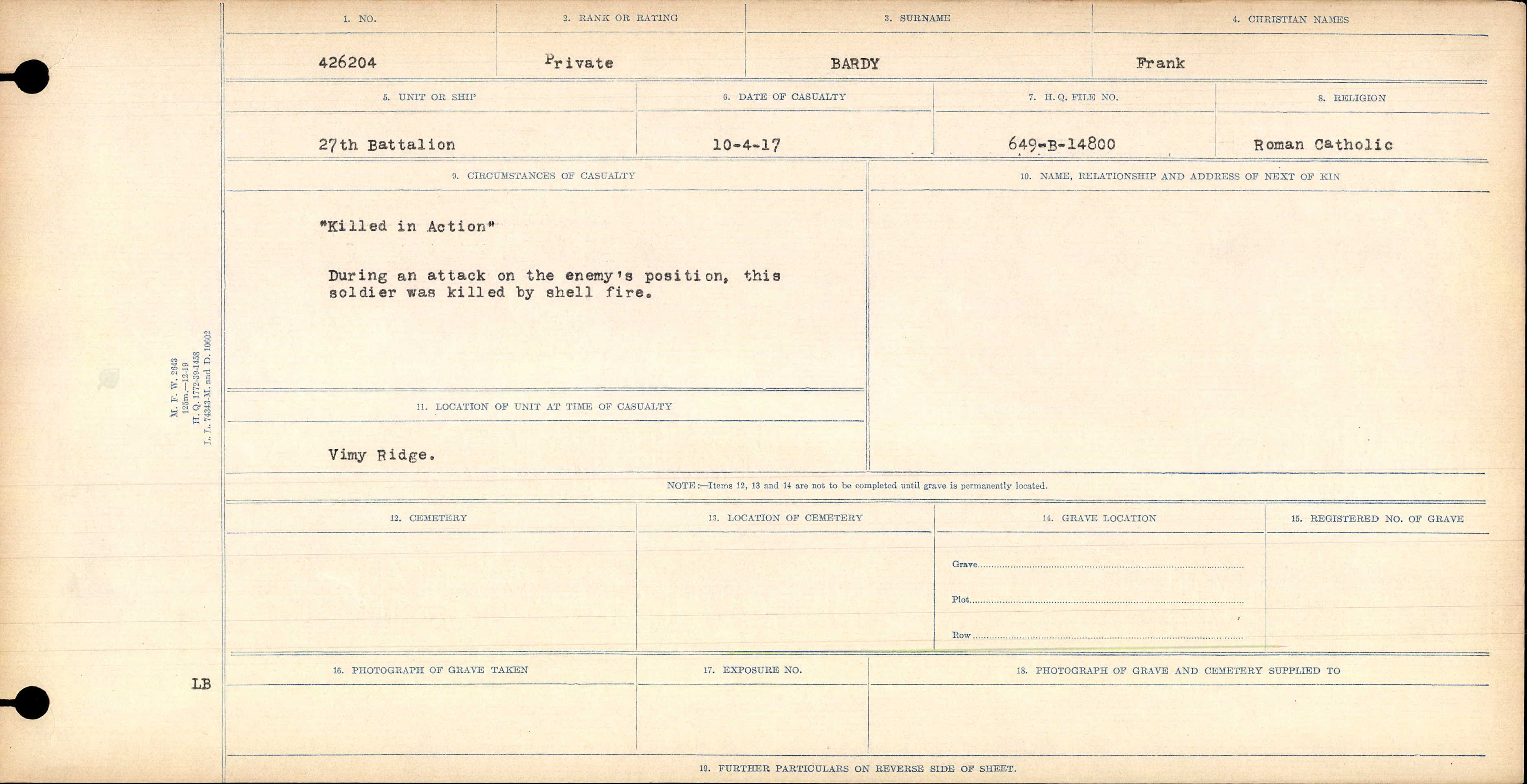On this day in 1917 Frank Bardy was killed by shell fire at the Battle of Vimy Ridge, while serving with the 27th Battalion.