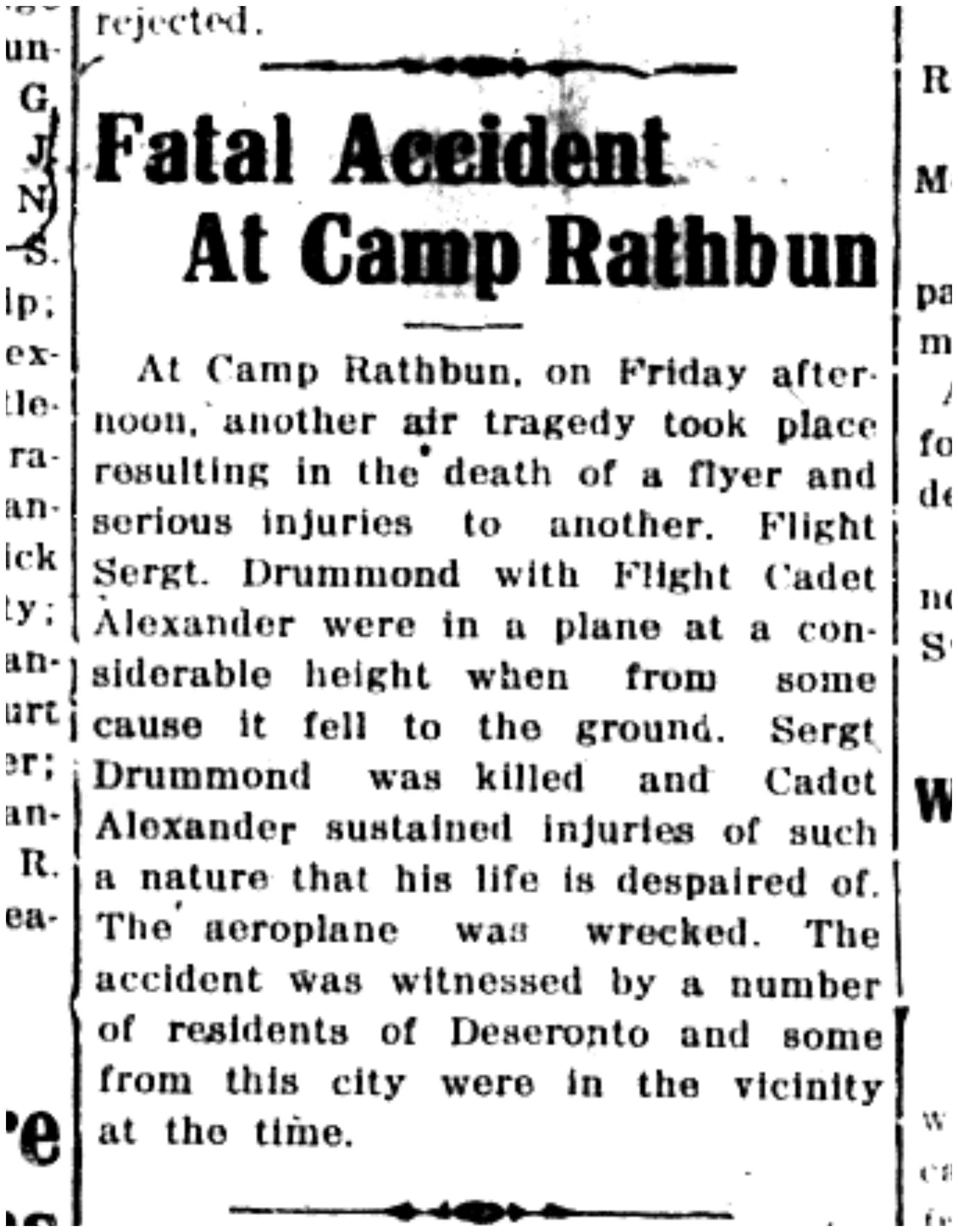 At Camp Rathbun, on Friday afternoon, another air tragedy took place resulting in the death of a flyer and serious injuries to another. Flight Sergt. Drummond with Flight Cadet Alexander were in a plane at a considerable height when from some cause it fell to the ground. Sergt. Drummond was killed and Cadet Alexander sustained injuries of such a nature that his life is despaired of. The aeroplane was wrecked. The accident was witnessed by a number of residents of Deseronto and some from this city were in the vicinity at the time.