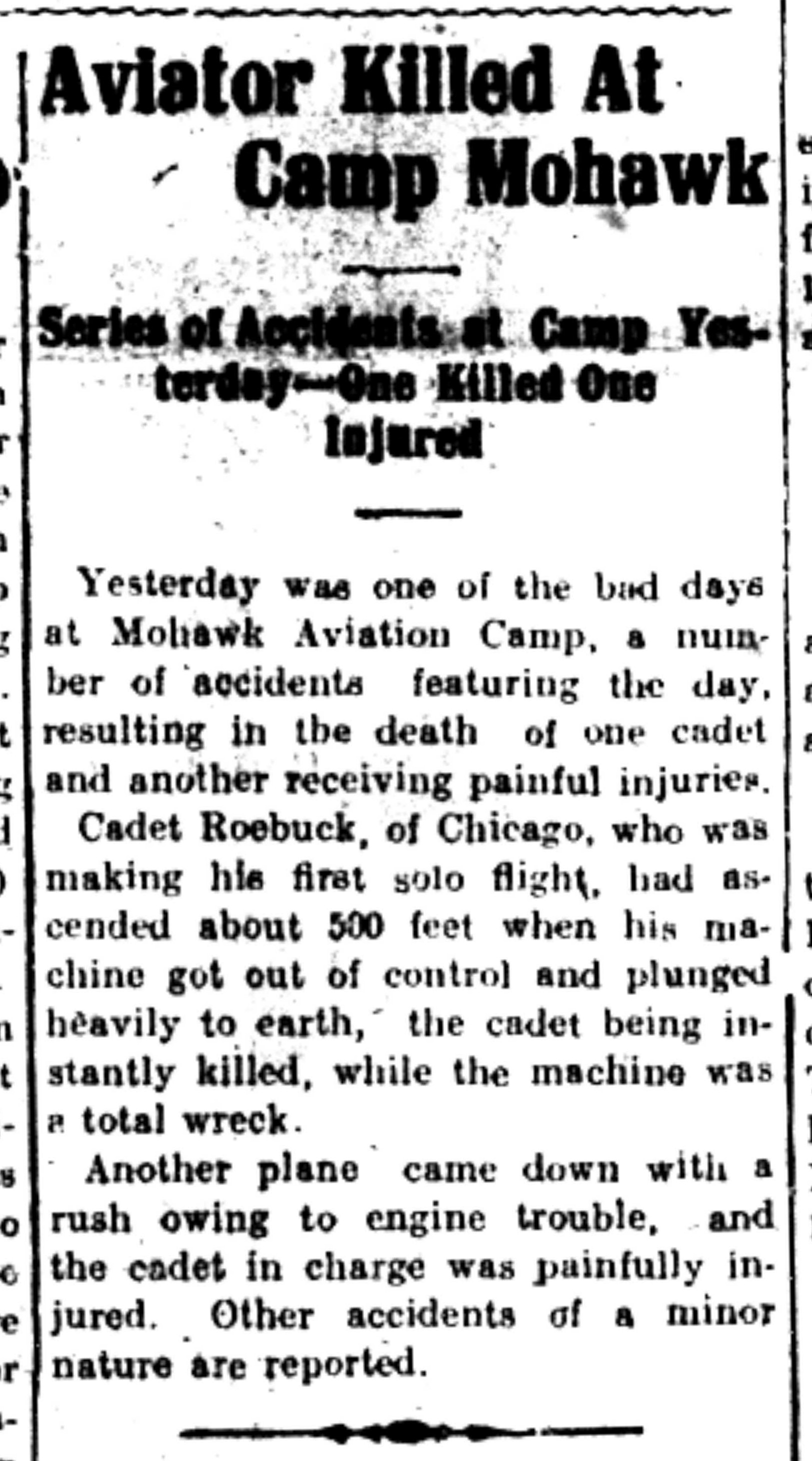 Yesterday was one of the bad days at Mohawk Aviation Camp, a number of accidents featuring the day, resulting in the death of one cadet and another receiving painful injuries.