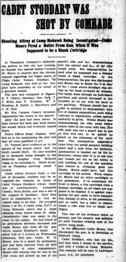 At Thompson Company’s undertaking parlors in this city last evening. an Inquest was opened before Coroner Dr. Boyce to enquire into the circumstances regarding the tragic death of Flight Cadet Vernon Stoddart. of Camp Mohawk, who died at the hospital here yesterday as the result of a gun-shot wound.