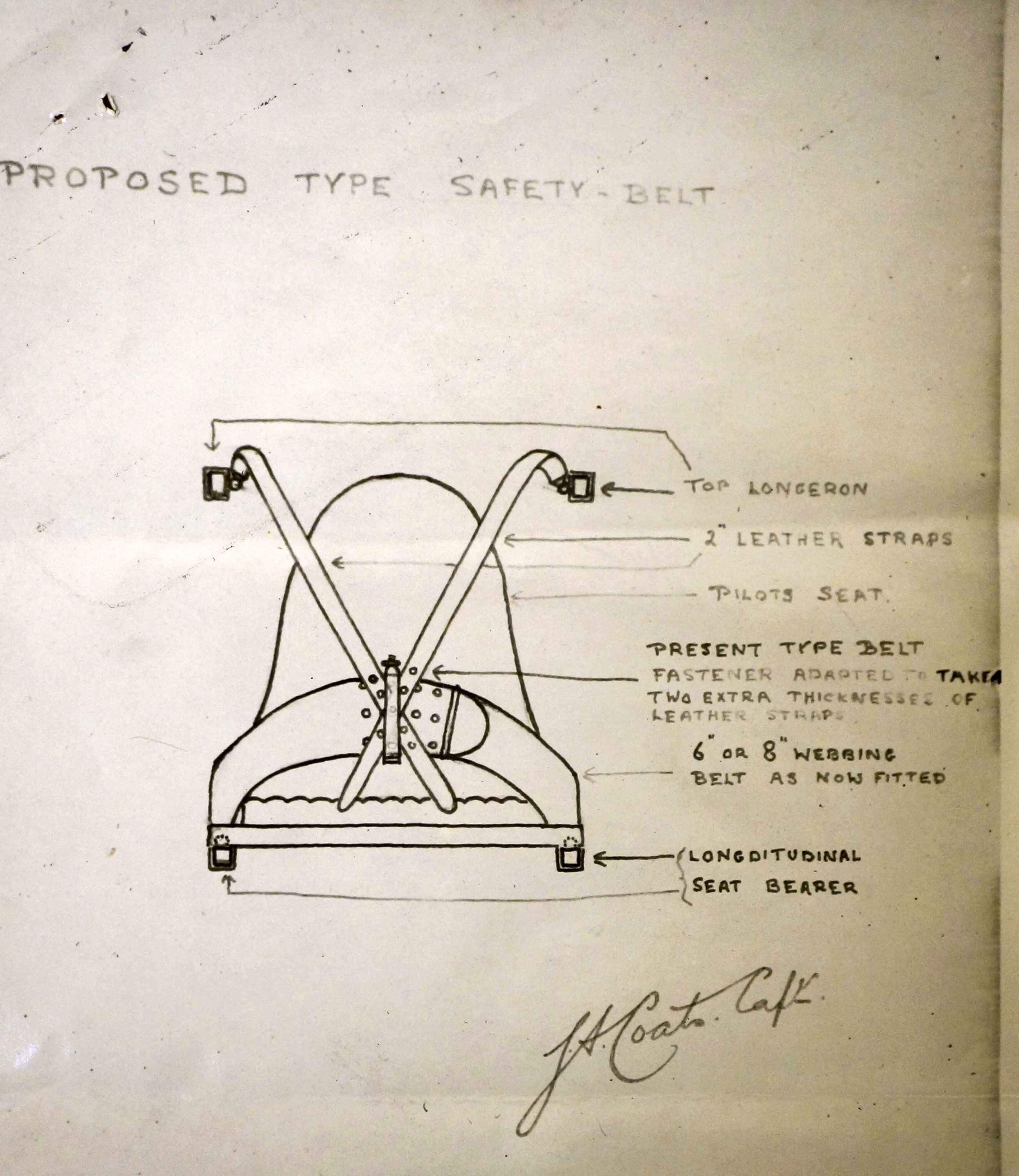 The Court of Inquiry into Worden’s accident found that his head had taken the brunt of the impact because his seat belt did not restrain him enough inside the aircraft. A sketch of a proposed improvement to the seat belt is included in the court record: