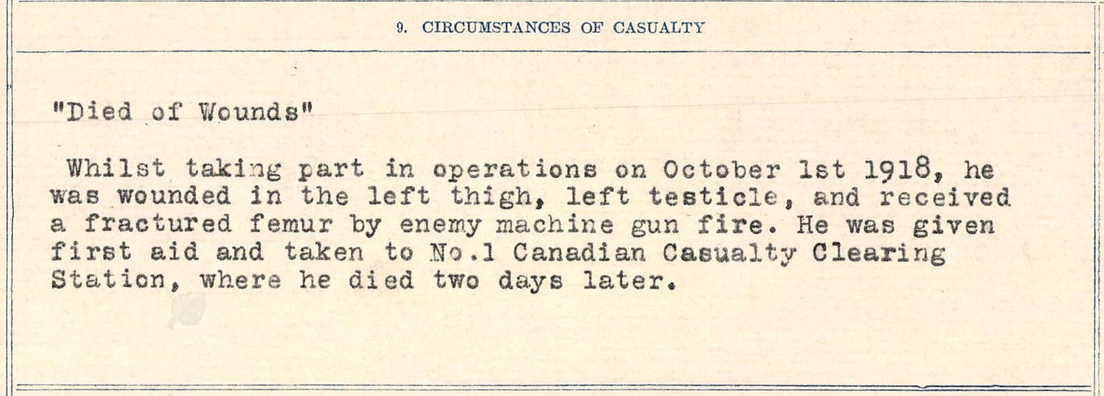 Whilst taking part in operations on October 1st 1918, he was wounded in the left thigh, left testicle, and received a fractured femur by enemy machine gun fire. He was given first aid and taken to No. 2 Canadian Casualty Clearing Station, where he died two days later.