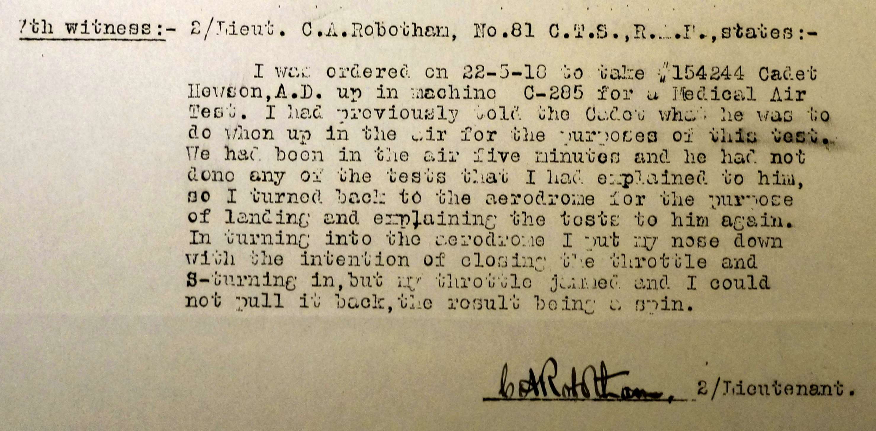 7th witness:– 2/Lieut. C.A.Robotham, No. 81 C.T.S., R.A.F., states:-